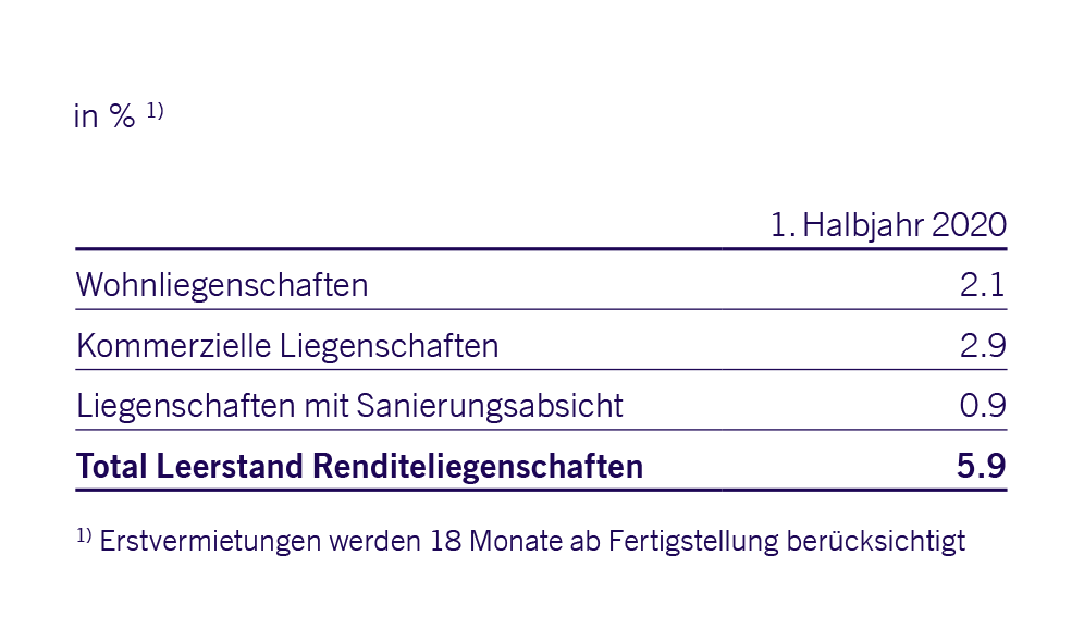 Der Leerstand der Renditeliegenschaften sank auf 5.85 %. Der Prozentsatz beinhaltet auch die leerstehenden Räumlichkeiten während der Gesamtsanierung der Liegenschaft Zuchwilerstrasse 41/43, Solothurn. Für einen grossen Teil der sich im Umbau befindlichen Dienstleistungsflächen direkt am Bahnhof Solothurn konnten bereits neue Mietverträge abgeschlossen werden.